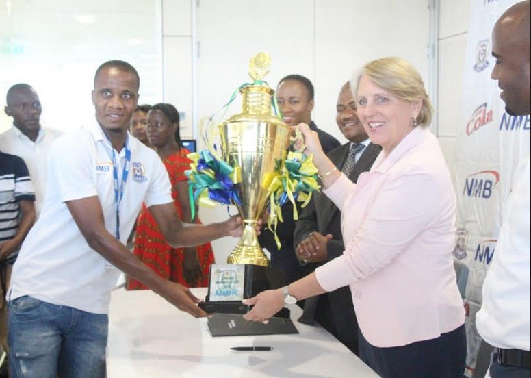 Nahodha wa Azam FC, Himid Mkami (kushoto) akikabidhiwa kombe la Mapinduzi lililochukuliwa na Azam FC Mkurugenzi Mtendaji wa Benki ya NMB, Bi. Ineke Bussemaker (kulia) leo jijini Dar es Salaam.[/caption][caption id="attachment_8473" align="aligncenter" width="802"]